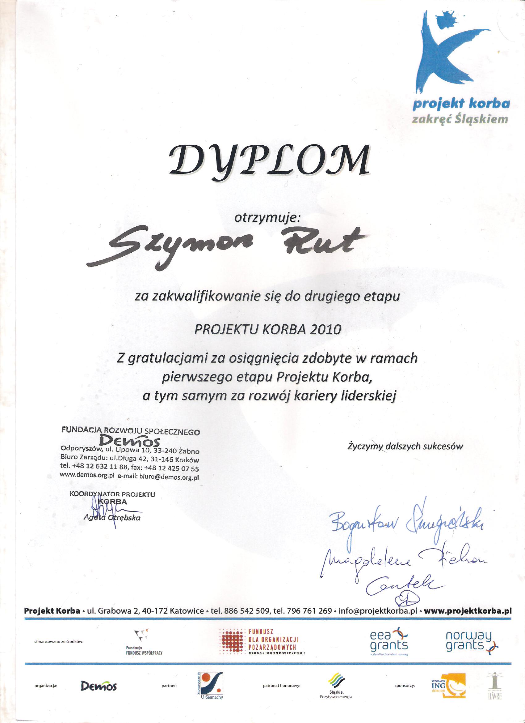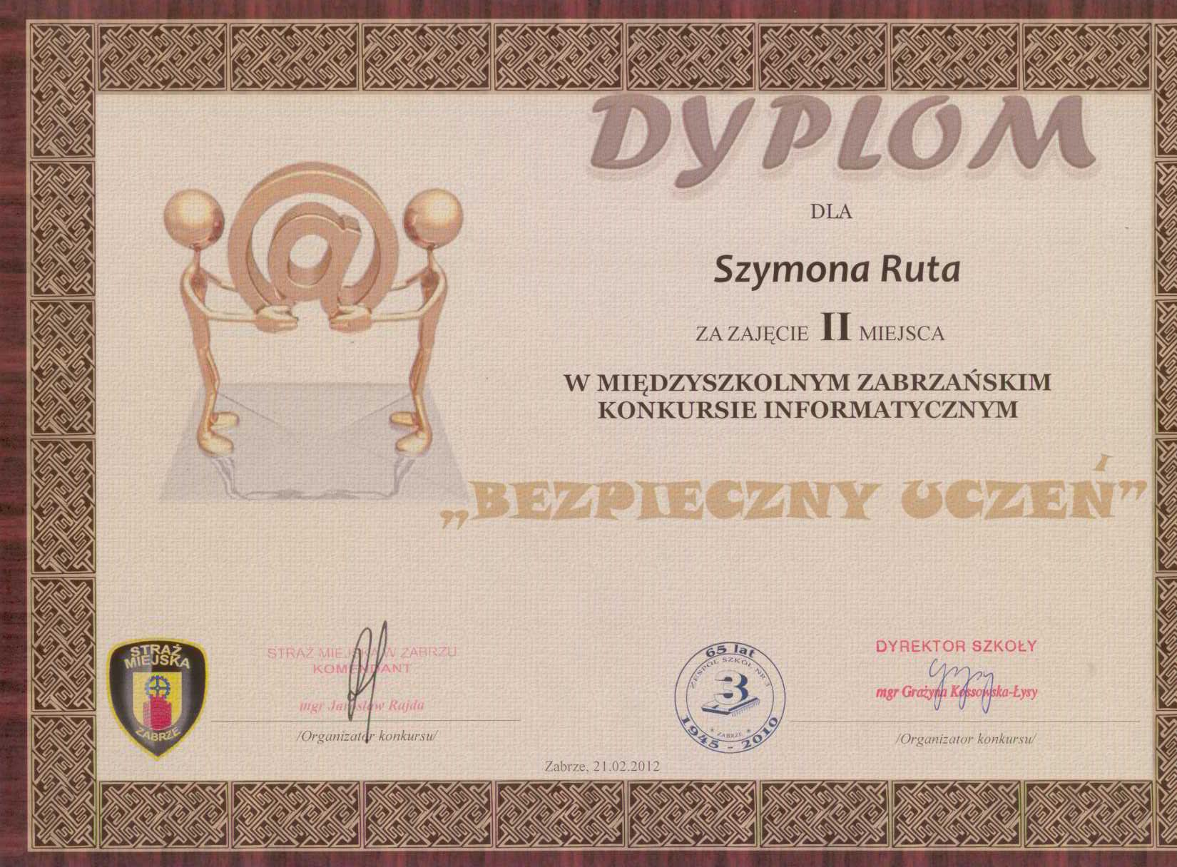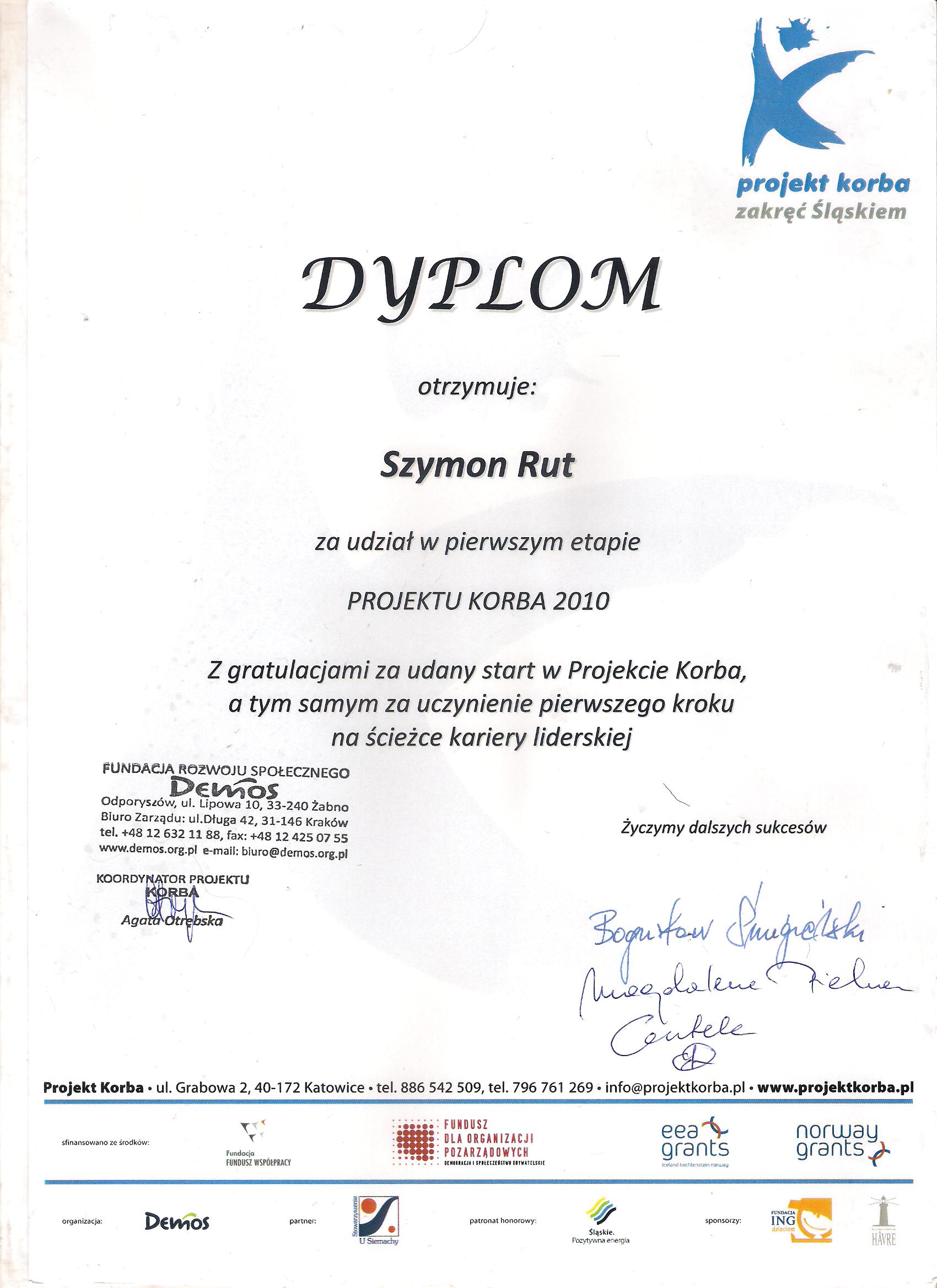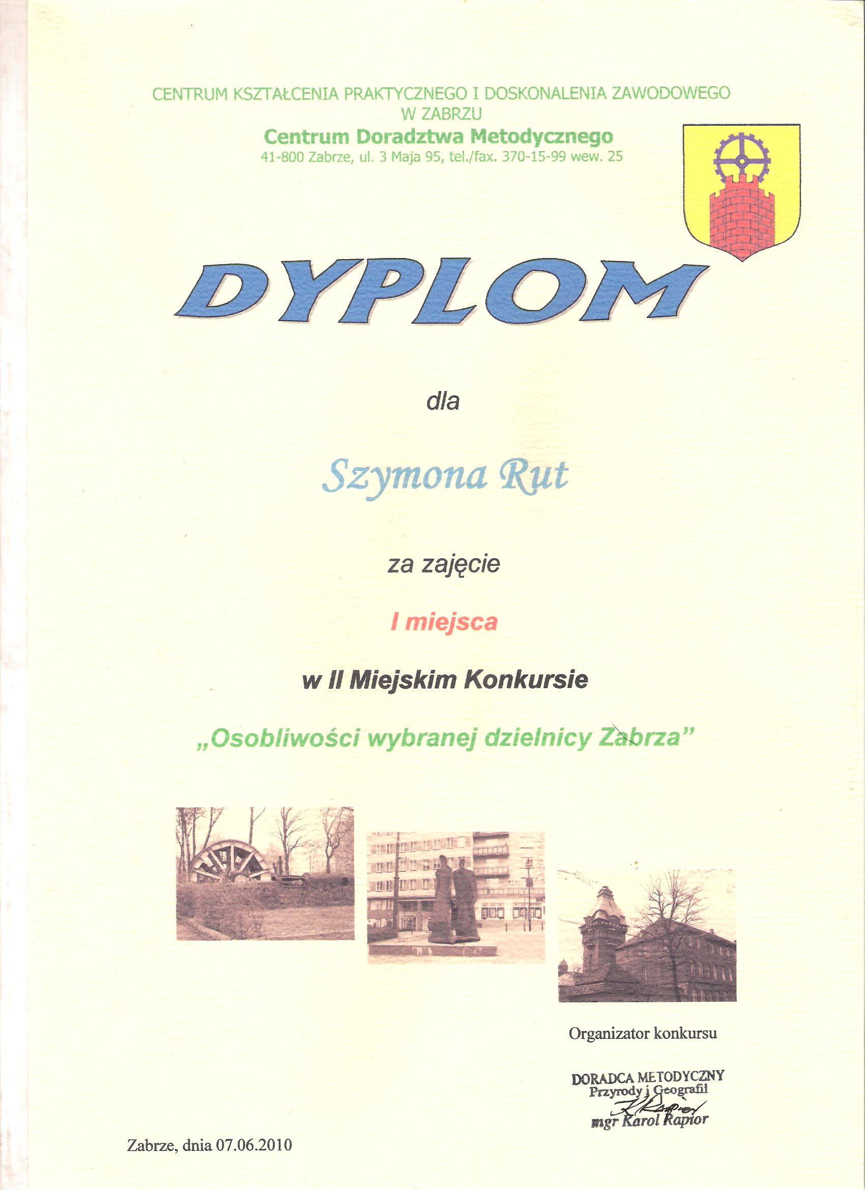 Szymon Rut był uczniem naszego technikum w latach 2008 - 2012. Miał wiele sukcesów w wielu różnych dziedzinach. Do najważniejszych zaliczyć można tytuł Laureata Olimpiady Innowacji Technicznej, w związku z tym był zwolniony z części teoretycznej egzaminu zawodowego. Uczestniczył z dużym powodzeniem w Finale Ogólnopolskiego Konkursu Informatycznego „Intersieć", gdzie zajął 30 miejsce. Był też finalistą Śląskiego Forum Liderów Młodzieżowych w ramach projektu KORBA, dlatego został zaproszony do udziału w warsztatach. Zajął również I miejsce w Konkursie Multimedialnym na temat osobliwości Zabrza.