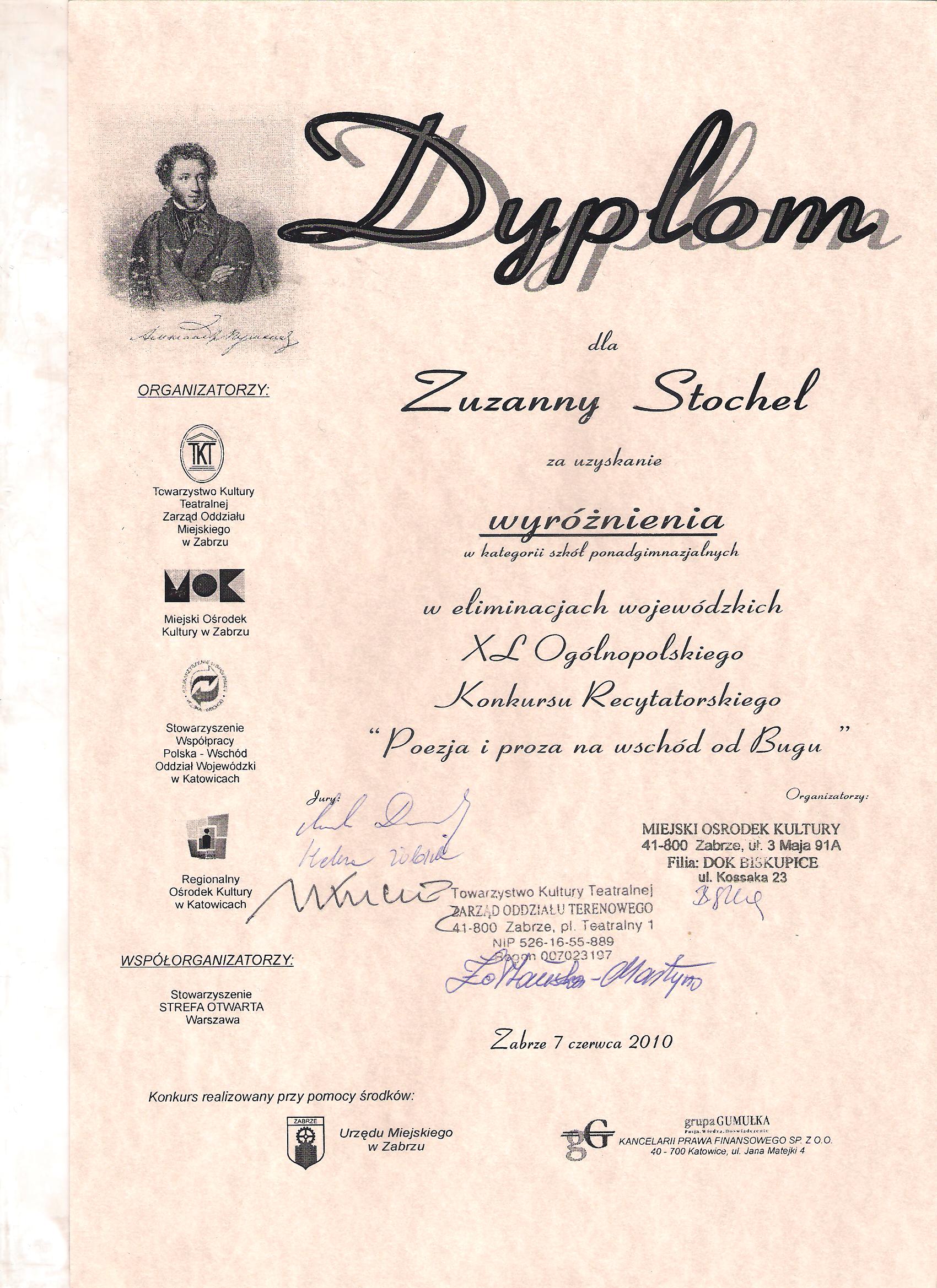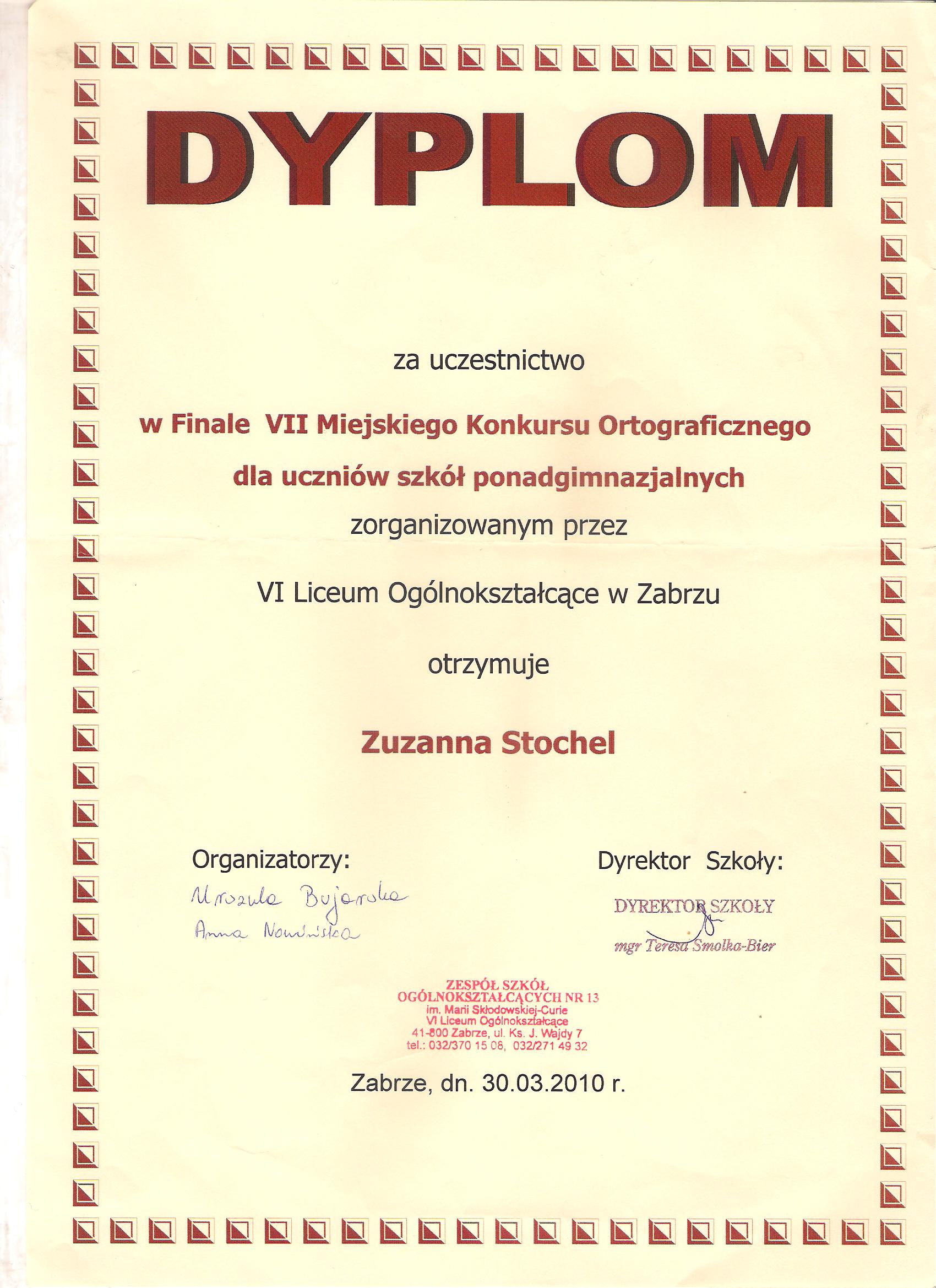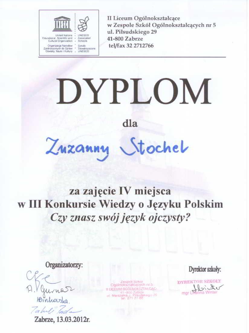 Zuzanna Stochel była uczennicą naszego Liceum Ogólnokształcącego w latach 2009 - 2012. W roku szkolnym 2009/2010 miała wiele sukcesów polonistycznych. Zakwalifikowała się do finału Miejskiego Konkursu Ortograficznego, zajęła też I miejsce w Miejskim Konkursie Recytatorskim „Juliusz Słowacki". Do najważniejszych osiągnięć Zuzanny można zaliczyć wyróżnienie w Wojewódzkim Konkursie „Poezja i proza na wschód od Bugu" . Oprócz wielu osiągnięć humanistycznych uczennica ma na swym koncie sukcesy z zakresu chemii - jest laureatką olimpiady na poziomie gimnazjum. Bardzo dobrze też śpiewa - w roku 2010/2011 zajęła I miejsce w Miejskim Konkursie Piosenki Religijnej oraz otrzymała wyróżnienie w Ogólnopolskim Konkursie Recytatorskim "Z Gałczyńskim łatwiej". Poza tym pokonała wszystkich uczestników Miejskiego Konkursu "Czy znasz swój język ojczysty?" zajmująć I miejsce.