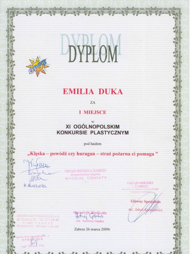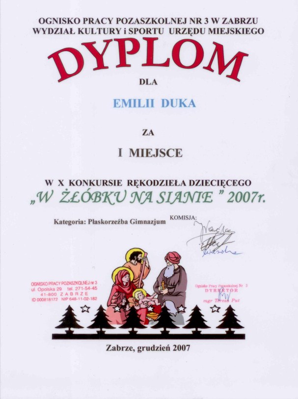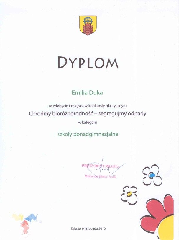 Emilia Duka była uczennicą naszego Liceum Ogólnokształcącego w latach 2009 - 2012. Wykazyała umiejętności plastyczne. Zajmowała czołowe miejsca w wielu konkursach na terenie kraju, województwa czy miasta. Jej prace była ciekawe, prezentowały interesujące podejście do tematu. Poza tym Emilia wspierała swoimi umiejętnościami wiele imprez szkolnych - dzięki jej dużej pracy w roku szkolnym 2010/2011 nasze stoisko na targach edukacyjnych otrzymało wyróżnienie oraz podziękowanie za szczególne zaangażowanie w wykonaną pracę.