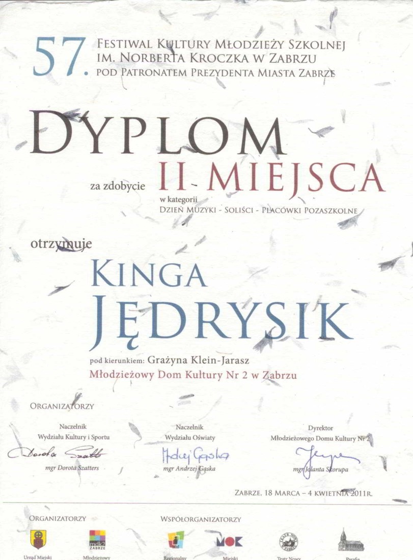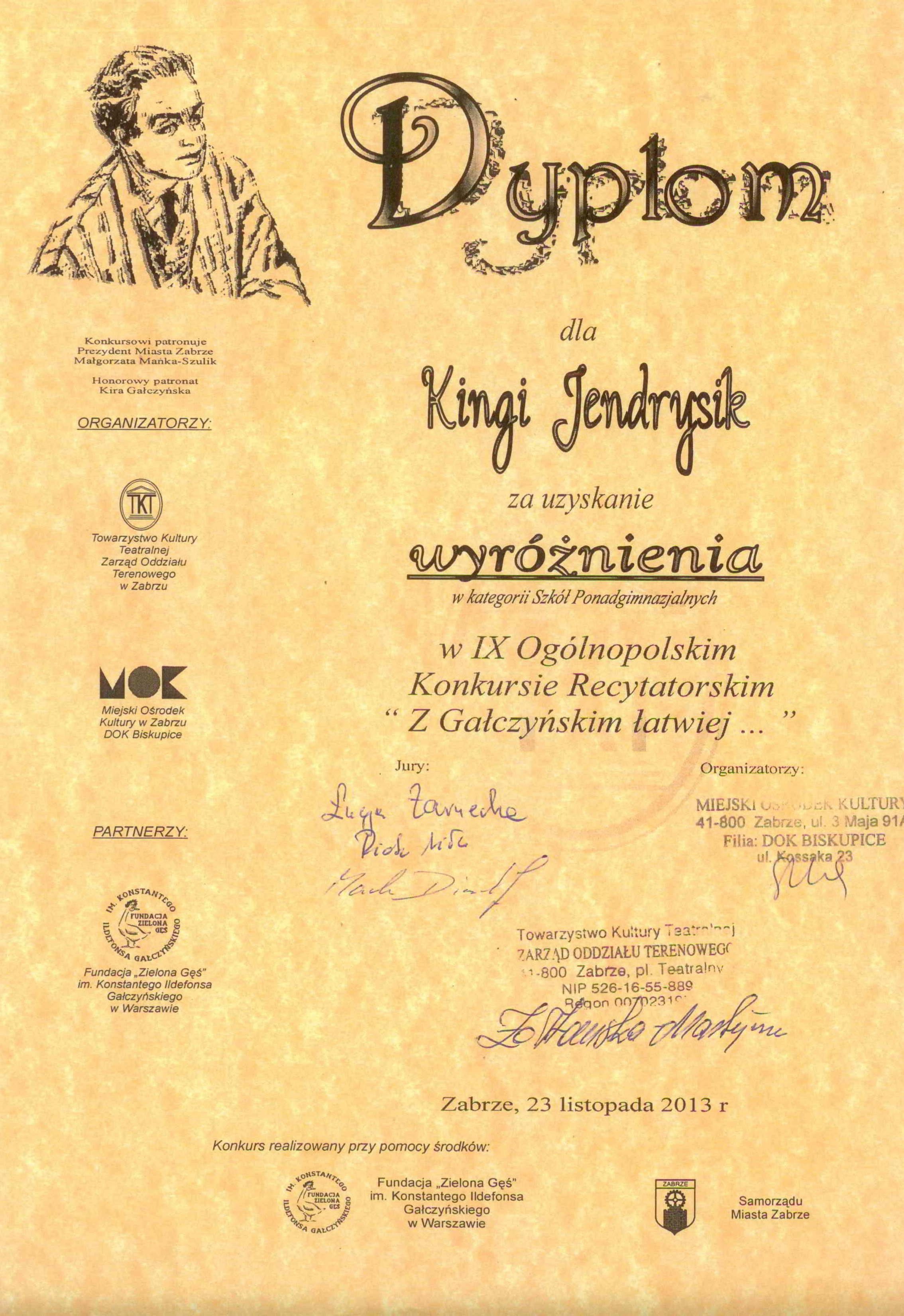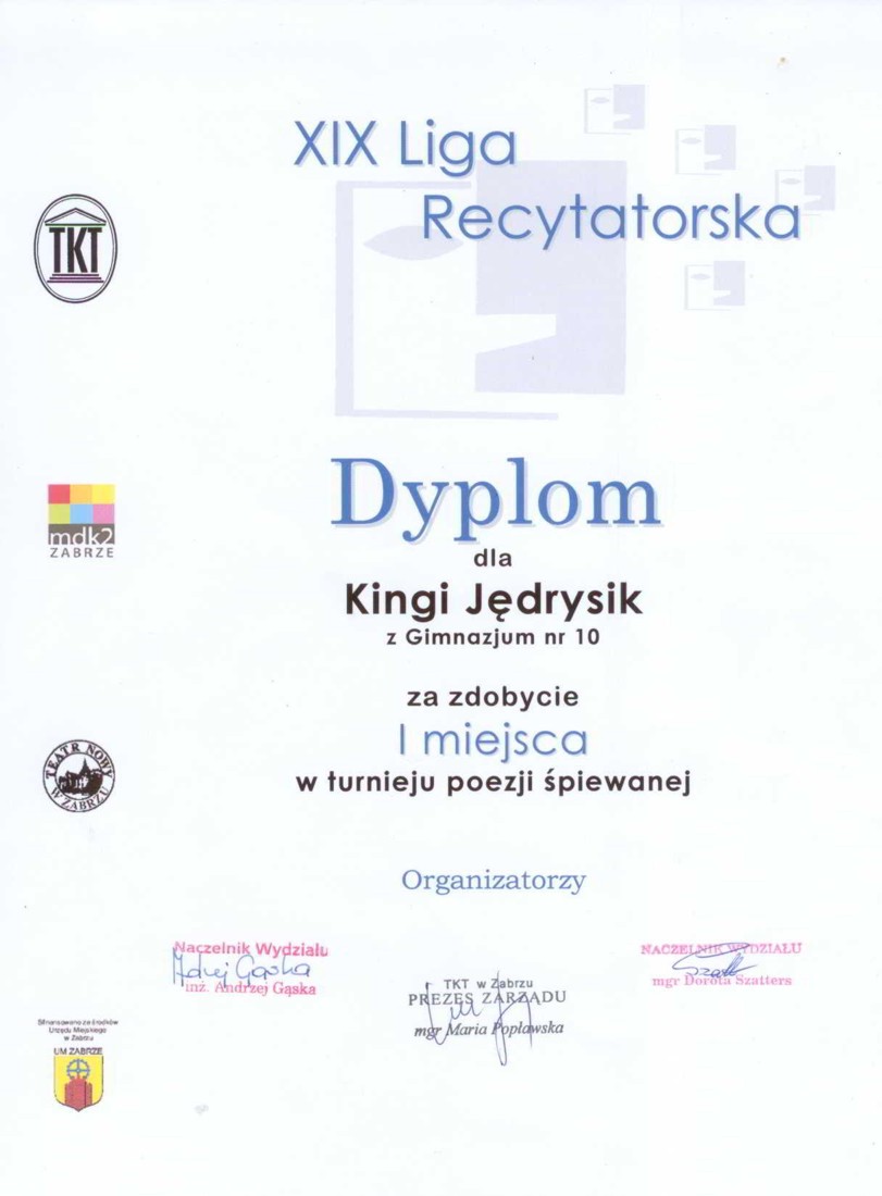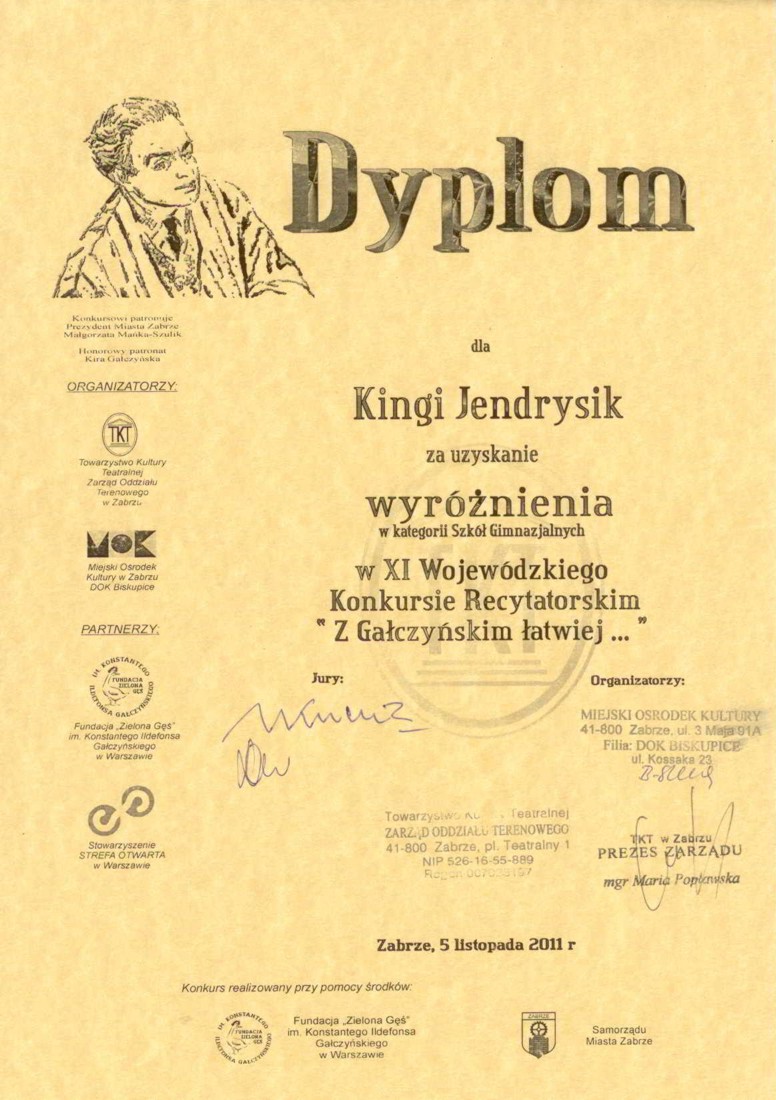 Kinga Jendrysik – uczennica naszego liceum - ma na swym koncie wiele sukcesów muzycznych. Bardzo dobrze śpiewa i potrafi interpretować teksty na różnego rodzaju konkursy poezji śpiewanej. Otrzymała wiele nagród i wyróżnień już w gimnazjum, do najważniejszych należą:
