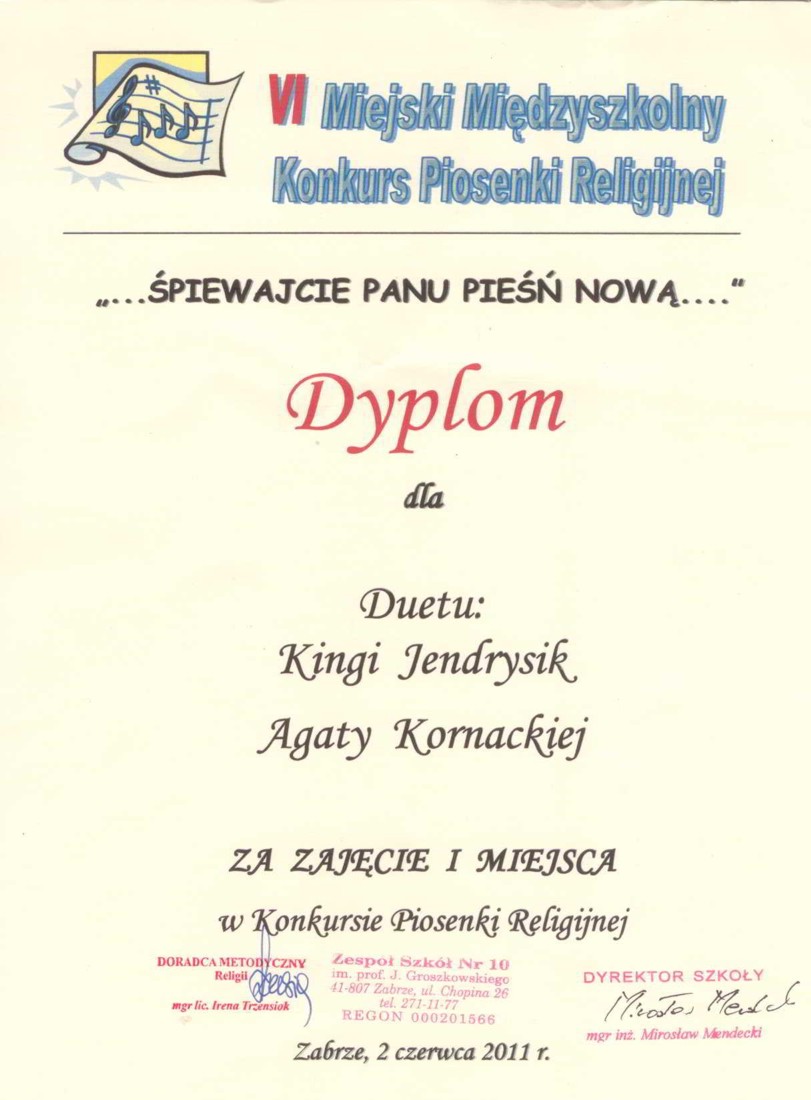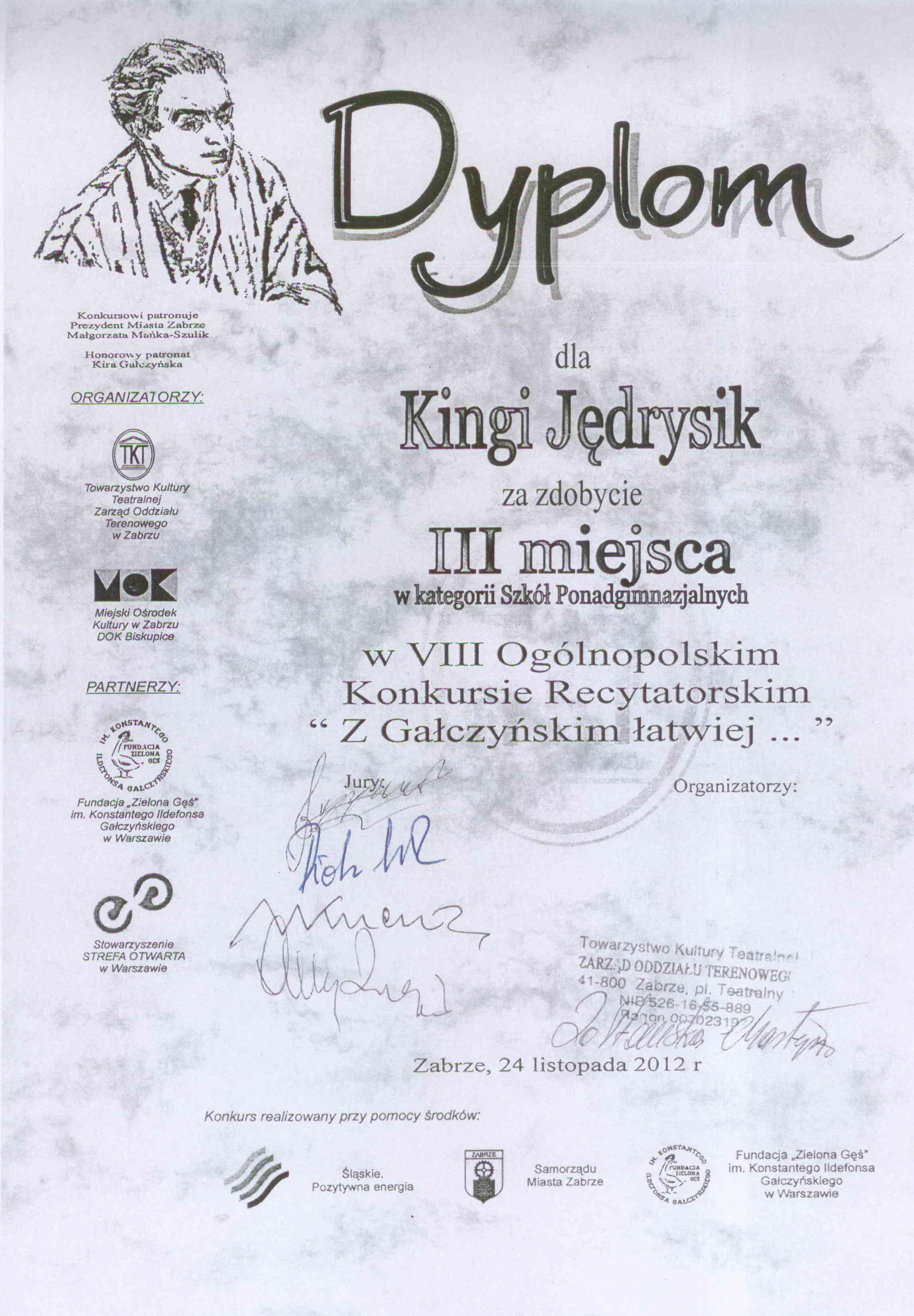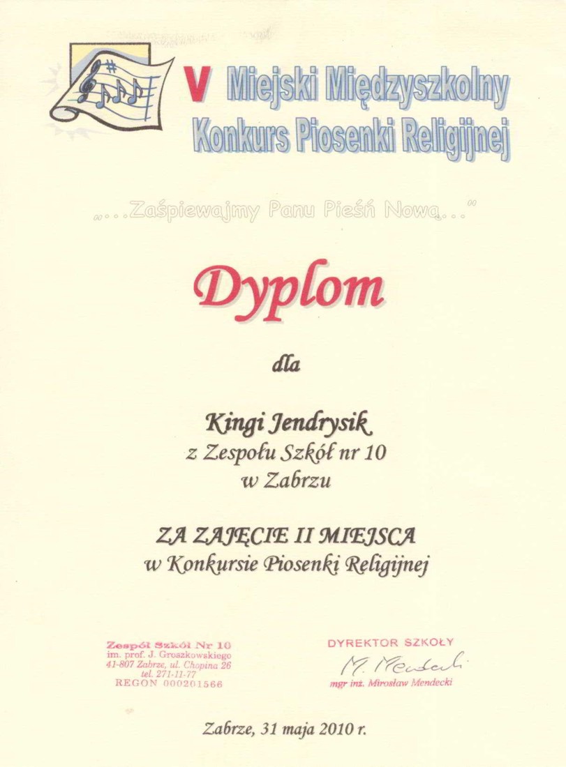 Kinga Jendrysik – uczennica naszego liceum - ma na swym koncie wiele sukcesów muzycznych. Bardzo dobrze śpiewa i potrafi interpretować teksty na różnego rodzaju konkursy poezji śpiewanej. Otrzymała wiele nagród i wyróżnień już w gimnazjum, do najważniejszych należą: