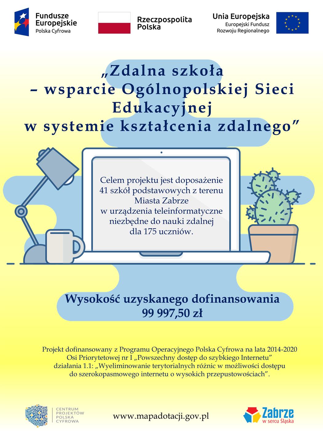 Projekt jest realizowany w ramach Programu Operacyjnego Polska Cyfrowa na lata 2014- 2020, Osi Priorytetowej nr I „Powszechny dostęp do szybkiego Internetu" działania 1. 1 „Wyeliminowanie terytorialnych różnic w możliwości dostępu do szerokopasmowego internetu o wysokich przepustowościach" dotycząca realizacji projektu grantowego pn.: Zdalna Szkoła- wsparcie Ogólnopolskiej Sieci Edukacyjnej w systemie kształcenia zdalnego w ramach Europejskiego Funduszu Rozwoju Regionalnego.