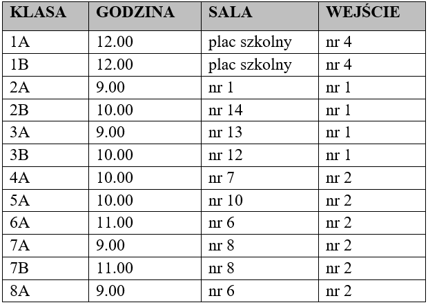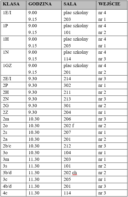 Klasy 1 godzina 9.00 plac szkolny. Po spotkaniu uczniowie przechodzą do klas pod opieką wychowawców wyznaczonymi wejściami.