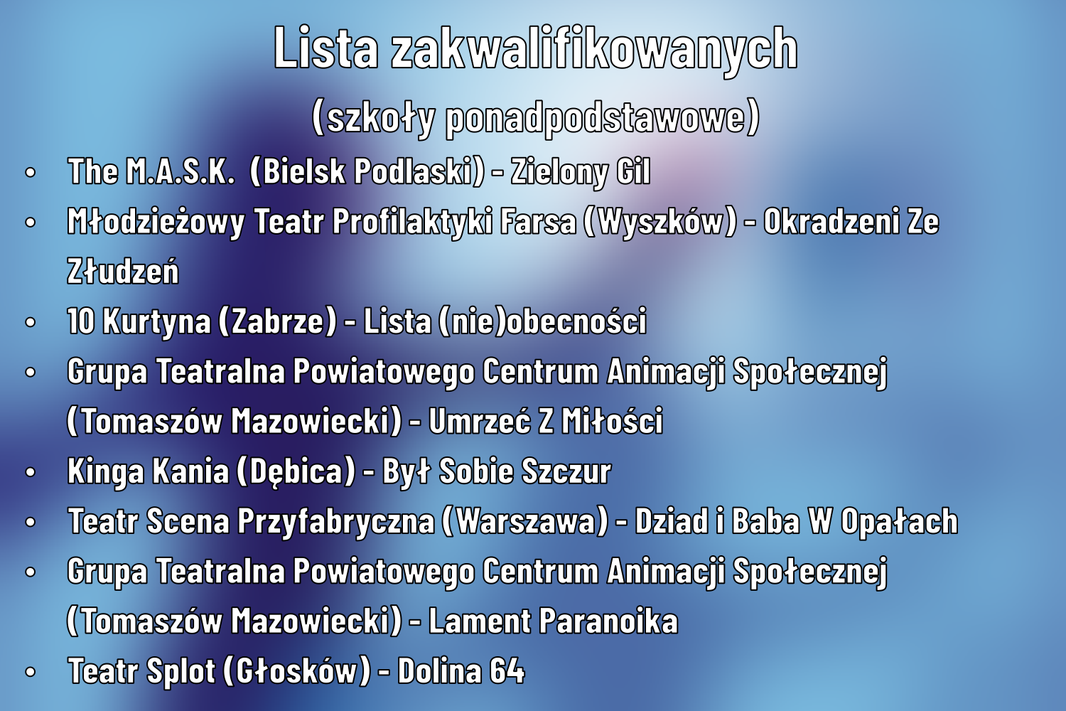 Zespół teatralny 10 Kurtyna zakwalifikował się do finału Ogólnopolskiego Przeglądu Teatralnego w Piasecznie. Znalazł się wśród najlepszych 8 zespołów z całej polski w kat. szkoły ponadgimnazjalne.