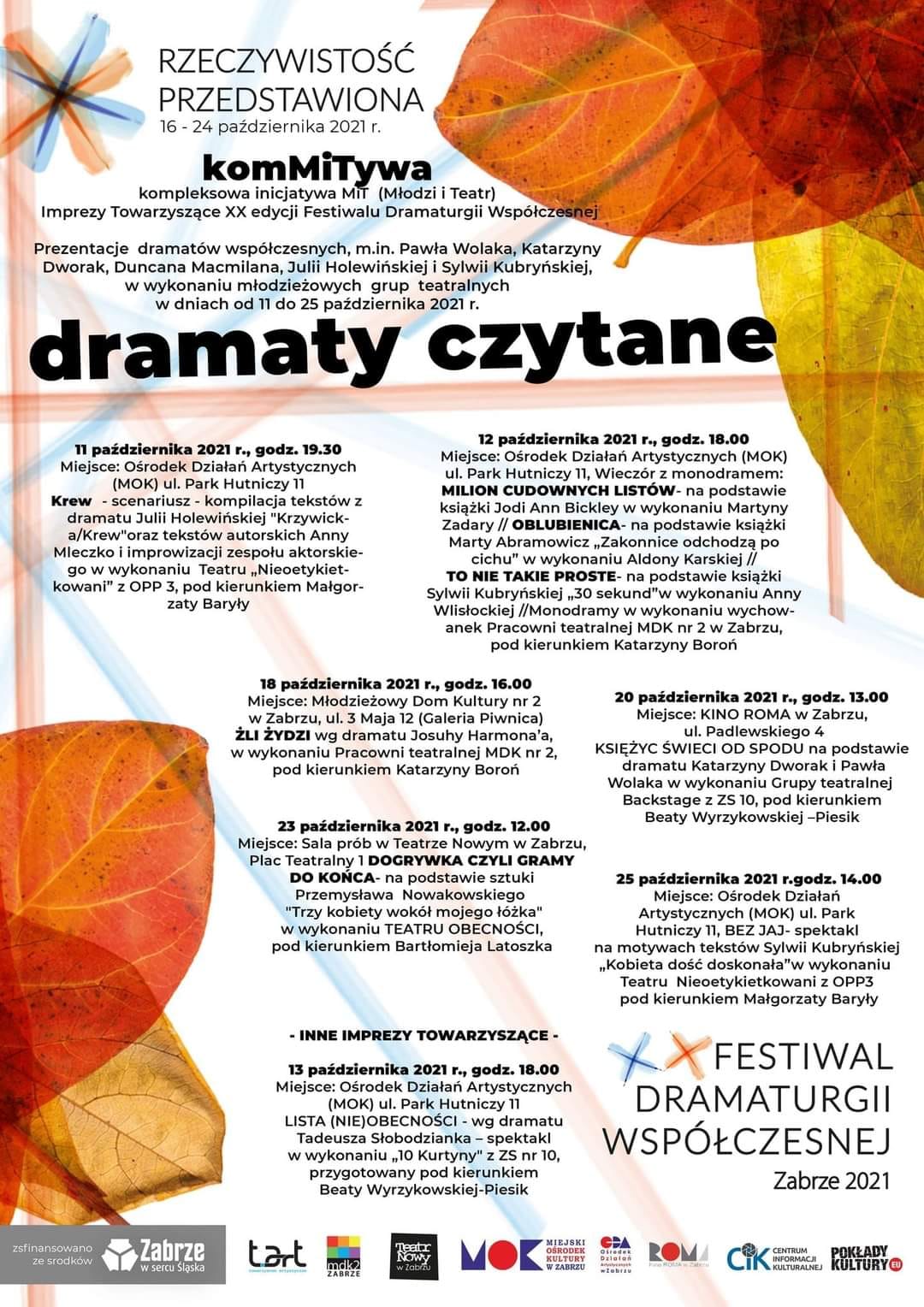 Zespoły teatralne grają w ramach FDW!Utworzono: 14 października 2021 | Drukuj | E-mail Nasze zespoły teatralne: 10Kurtyna i Backstage grają w ramach XX Festiwalu Dramaturgii Współczesnej. Warto przyjść na spektakle. Zapraszamy! Poprzedni artykuł Następny artykuł
