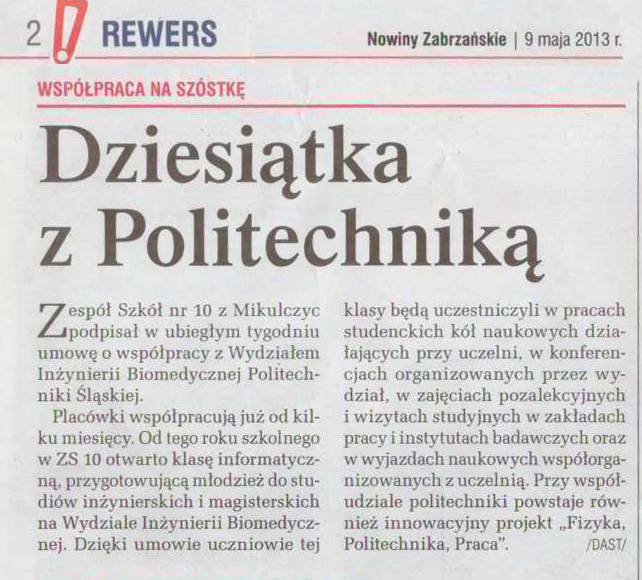 W kwietniu 2013 roku zapieczętowaliśmy, w uroczysty sposób, współpracę naszej szkoły z Politechniką Śląską. Klasa Ic naszego biomedycznego technikum od tej chwili została objęta patronatem Wydziału Inżynierii Biomedycznej. Uczniowie uczestniczą regularnie w ciekawych zajęciach organizowanych przez uczelnię. Są to najczęściej lekcje laboratoryjne, praktyczne, bądź wykłady interesujących ludzi, profesorów, zasłużonych sław.