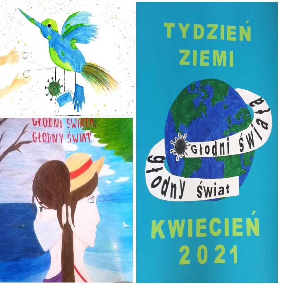 Uczniowie naszej szkoły Weronika Braun - 7B, Kinga Kamińska 1P i Gracjan Pieczko 1EI, zdobyli wyróżnienia w Wojewódzkim Konkursie Plastycznym w kategorii plakat XXVIII Tygodnia Ziemi "Głodni Świata – Głodny Świat” 2021.