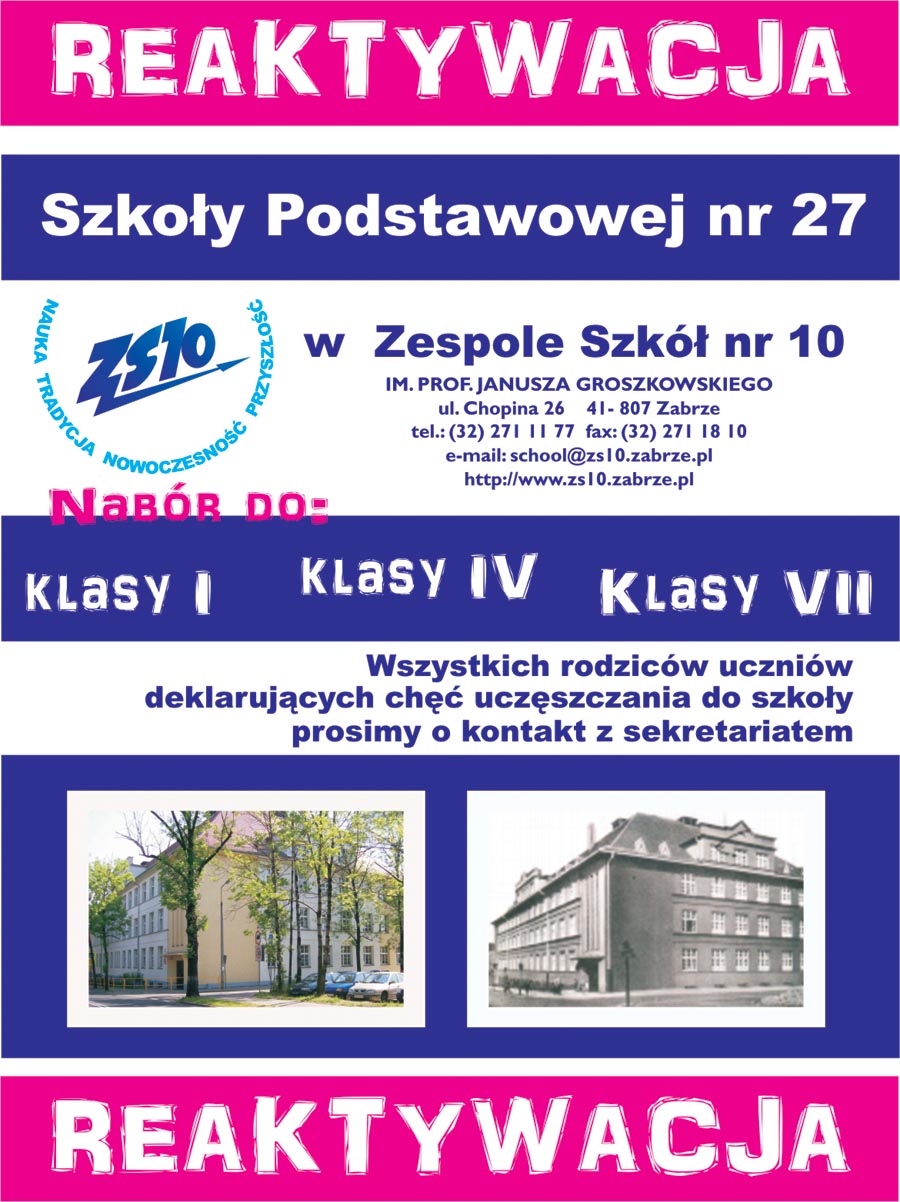 W związku z reformą oświaty do Zespołu Szkół nr 10 przy ulicy Chopina 26 wraca od przyszłego roku szkolnego Szkoła Podstawowa nr 27. W lutym prowadzony będzie nabór do klas czwartych i siódmych. Wszystkich rodziców uczniów klas trzecich i szóstych deklarujących chęć zmiany obecnej szkoły prosimy o kontakt z sekretariatem szkoły. Nabór do klas pierwszych odbędzie się w późniejszym terminie (najprawdopodobniej w marcu).