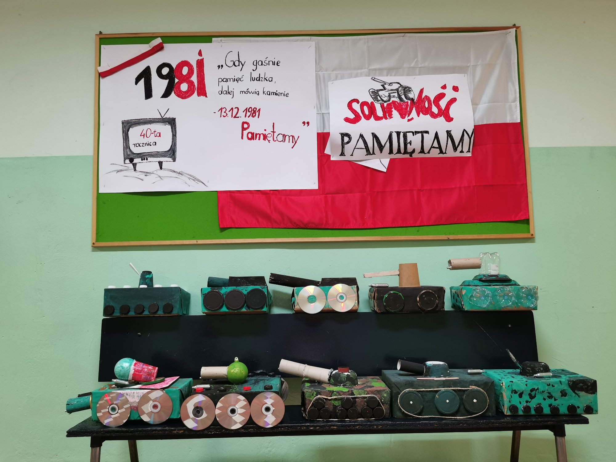 W ubiegłych miesiącach uczniowie Szkoły Podstawowej uczestniczyli w projekcie Pamięć 81., którego celem było przygotowanie dzieci i młodzieży do świadomego przeżywania obchodów 40 rocznicy wprowadzenia w Polsce stanu wojennego. W ramach projektu uczniowie uczestniczyli w lekcji historii z wykorzystaniem materiałów przygotowanych przez IPN, brali udział w konkursach plastyczno - literackich m.in "Tropiciele historii". Młodsi uczestnicy projektu współuczestniczyli przy przygotowaniu gazetki szkolnej, w ramach której wykonali plakaty oraz makiety czołgów z materiałów nadających się do recyklingu.